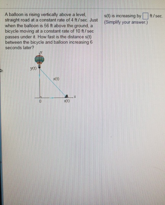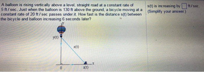 WebFrom a balloon vertically above a straight road,the angles of depression of two cars at an instant are found to 45 ° and 60 ° , if the cars are 100m apart ,find the. WebA balloon is rising vertically above a level, straight road at a constant rate of 5 ft divided by sec. Just when the balloon is 106 ft above the ground, a bicycle. WebA balloon is rising vertically above a level, straight road at a constant rate of 1 foot/second. Just when the balloon is 65 feet above the ground, a bicycle passes under it. WebFrom a balloon vertically above a straight road, the angles of depression of two cars at an instant are found to be 45 0 and 60 0. If the cars are 100m apart, find the. WebA balloon is rising vertically above a straight road at constant rate of 1 ft/sec. When the balloon reaches 65ft above the ground, a bicycle passes under it at a constant rate of 17. WebQuestion 857246: A hot air balloon is floating above a straight road. To estimate their height above the ground, the balloonists simultaneously measure the angle of depression to two. WebTranscribed image text: A balloon is rising vertically above a level, straight road at a constant rate of 5 ft/sec. Just when the balloon is 33 ft above the ground, a bicycle.