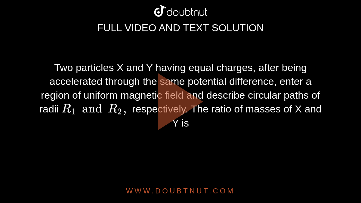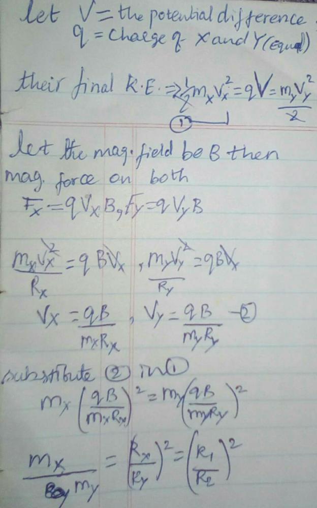 Two particles X and Y having equal charges, after being accelerated through the same potential difference, enter a region of uniform magnetic field and describe circular paths of radii `R_1 and R_2,` respectively. The ratio of masses of X and Y is