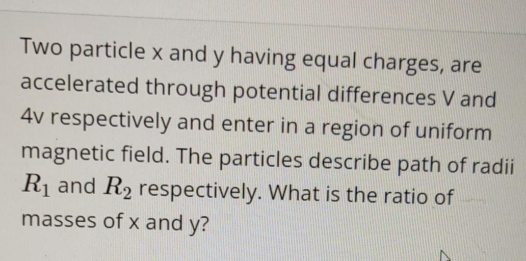 WebWe are given that two particles X and Y having equal charges, say q, are being accelerated through a potential difference. This means that the motion of the. WebSolution For Two particles X and Y having equal clarges, after being accelerated through the same potential difference, enter a region of uniform magn.. WebQ. Two particles X and Y having equal charges, are accelerated through the same potential difference. They enter a region of a uniform magnetic field and describe a. WebGrade. Two particles X and Y having equal charges after being. | Two particles X and Y having equal charges, after being accelerated through the same potential. WebTwo particles X and Y having equal charges, after being accelerated through the same potential difference, enter a region of uniform mag. field and describe circular. WebTwo particles X and Y having equal charges, after being accelerated through the same potential difference, enter a region of uniform magnetic field and describe circular paths of. WebTwo particles X and Y having equal charges after being | Two particles X and Y having equal charges, after being accelerated through the same potential difference, enter a region of. WebTwo particles X and Y having equal charges, after being accelerated through the same potential difference, enter a region of uniform magnetic field and describe. WebTwo particles X and Y having equal charges, after being acceleration through the same potential difference, enter a region of uniform magnetic field and describe circular paths of.