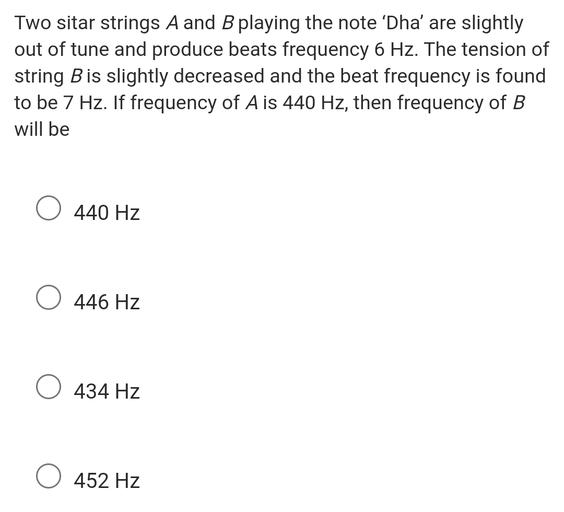 Two sitar strings A and B playing the note \'Dha\' are slightly out of tune and produce beats of frequency 5 Hz. The tension of string B is slightly increased and the beat frequency is found to decrease to 3 Hz. What is the original frequency of B, if the frequency of A is 427 Hz?